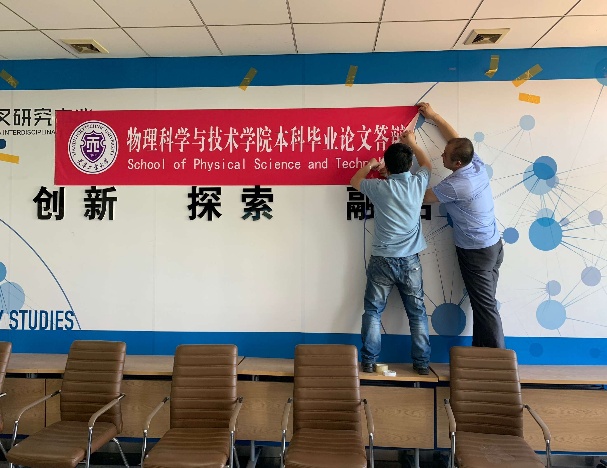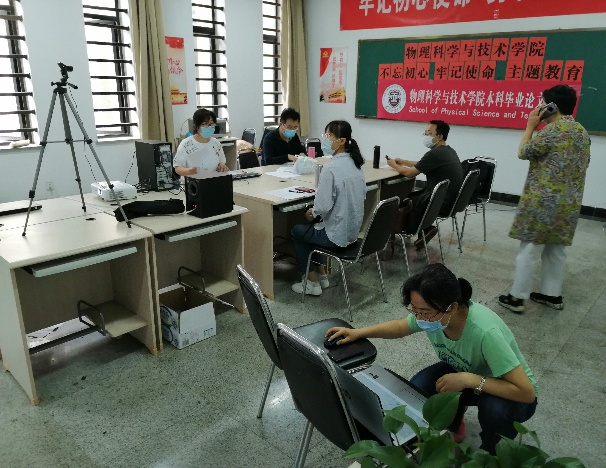 在答辩会开始前,学院根据疫情防控要求,制定详尽的线上、线下答辩方案。院毕业论文办公室刘晓东教授牵头对会场进行了精心的布置,并组织各答辩小组进行答辩前的设备熟悉,组织师生进行预演,制定了应急预案,确保答辩当天所有设备运转正常,网络通畅。行政副院长廖帮全亲自带领院办工作人员负责答辩当日的运维,对答辩过程进行了全程值守。