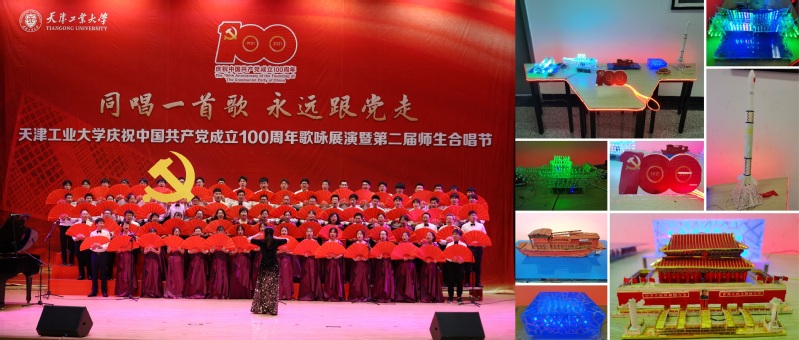 为充分展示学院广大师生爱党爱国的红色情怀,学院党委积极参加国产直播 “同唱一首歌 永远跟党走”庆祝中国共产党成立100周年歌咏展演暨第二届师生合唱节。共唱《伟大的中国伟大的党》,陶冶了学院师生爱党爱国的高尚情操,唱出了团结,唱出了力量,唱出了共同奋斗的强大信心。学院党委还积极组织物理创新实验中心教师和学院“天工开物”学生专业社团的同学们,围绕中国共产党的百年光辉历程,选取建党百年中的重大事件和辉煌时刻为设计元素,经过认真组织策划和三个月的精心设计制作,完成了彰显物理学科专业特色、发挥师生特长的红色光电作品展。