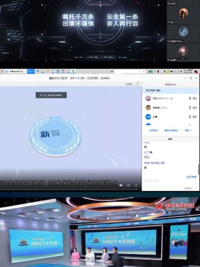 4月13日至4月15日,国产直播 组织学生召开了安全教育主题班会。学院以班级为单位,由班委带领全班同学观看了“千万师生同上一堂国家安全教育课”为主题的公开课和“反邪教警示教育进校园”专题的警示教育宣传片,以提高师生防范邪教的意识和能力。此次活动也旨在提高学生们的保密意识,引导学生进一步增强安全意识和法制观念,自觉守法护法。