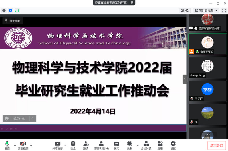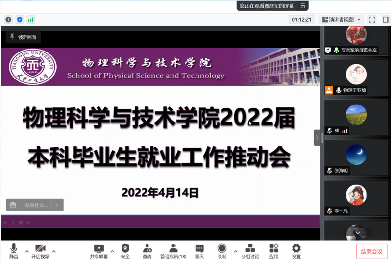 为认真贯彻习近平总书记重要指示精神和党中央、国务院“稳就业”“保就业”决策部署,落实教育部《关于做好2022届普通高校毕业生就业创业工作的通知》的具体工作要求,进一步加强疫情防控常态化下毕业生的就业指导与服务工作,确保毕业生更高质量更充分就业,4月14日,国产直播 在线分别召开2022届研究生及本科毕业生就业工作中期推动会,专题研究部署疫情形势下进一步加强2022届毕业生就业工作举措。学院领导班子、系室主任、毕业班研究生导师、班导师和全体辅导员出席本次会议,会议由学院党委副书记贾彦军主持。
