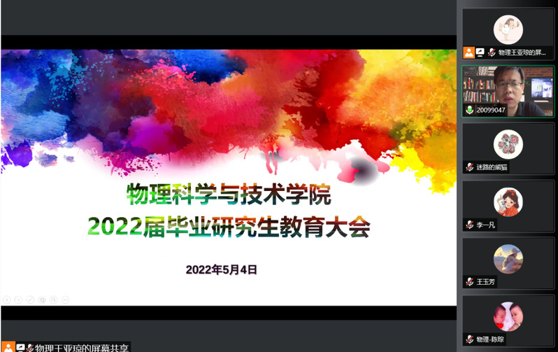 为进一步加强毕业生离校教育和毕业生党员的党性教育,2022年5月4日下午,国产直播 通过腾讯会议召开了2022届毕业研究生教育大会暨毕业研究生主题党课教育活动。学院班子全体成员、导师代表、办公室、科研办、学生办工作人员以及2022届全体毕业研究生参加了此次大会。会议由学院党委副书记贾彦军主持。
