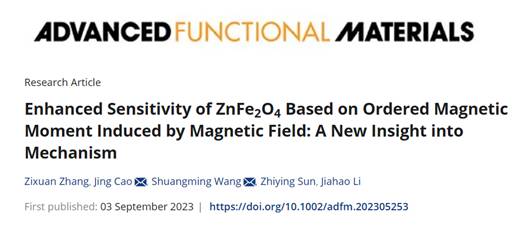国产直播 曹静课题组近期在《Advanced Functional Materials》发表题目为Enhanced Sensitivity of ZnFe2O4 Based on Ordered Magnetic Moment Induced by Magnetic Field: A New Insight into Mechanism的研究成果。该工作的第一作者为硕士研究生张子瑄,曹静和王双明为该论文的通讯作者。