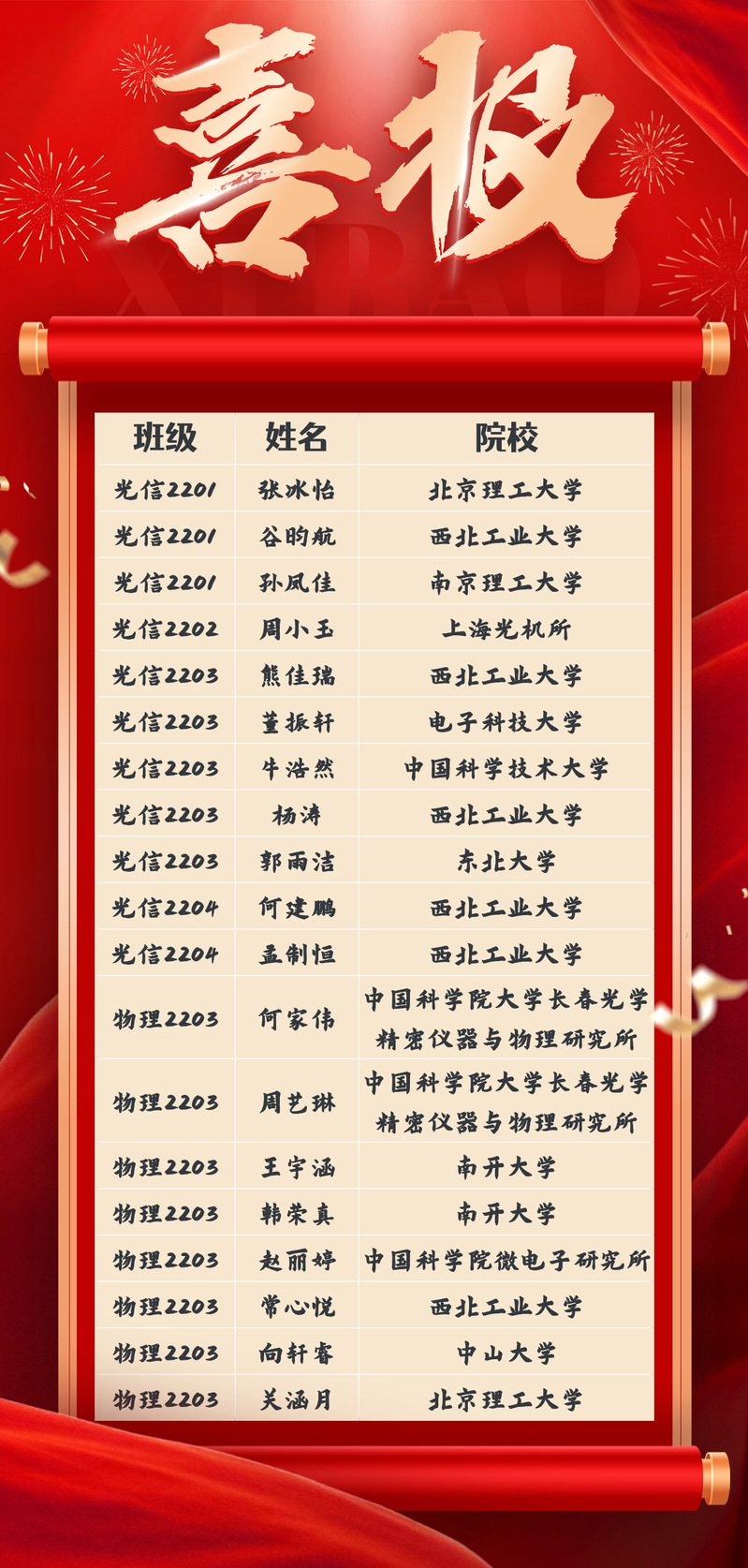 用智慧点亮未来,以拼搏铸就梦想。国产直播 2026届19名同学成功推免保研到理想的高校,其中,有11名同学来自光电信息科学与工程专业,有8名同学来自应用物理学专业。